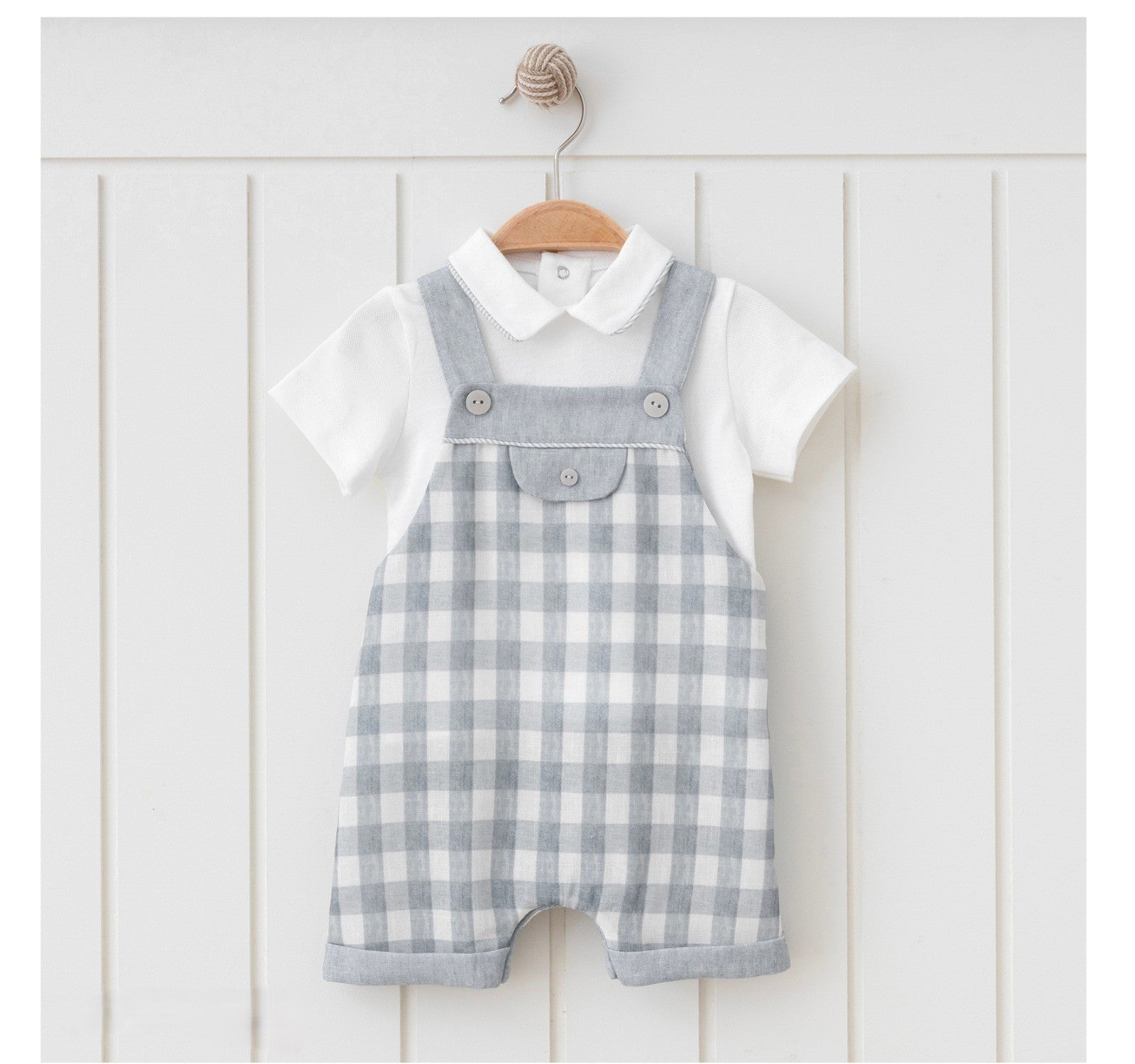 This one-piece features a classic grey checkered design, perfect for little boys. Complete with cute suspenders, it offers a sophisticated yet playful look. Made with high-quality materials, it ensures comfort and durability for your little one. The perfect choice for any occasion, this one-piece is a must-have for any stylish boy.